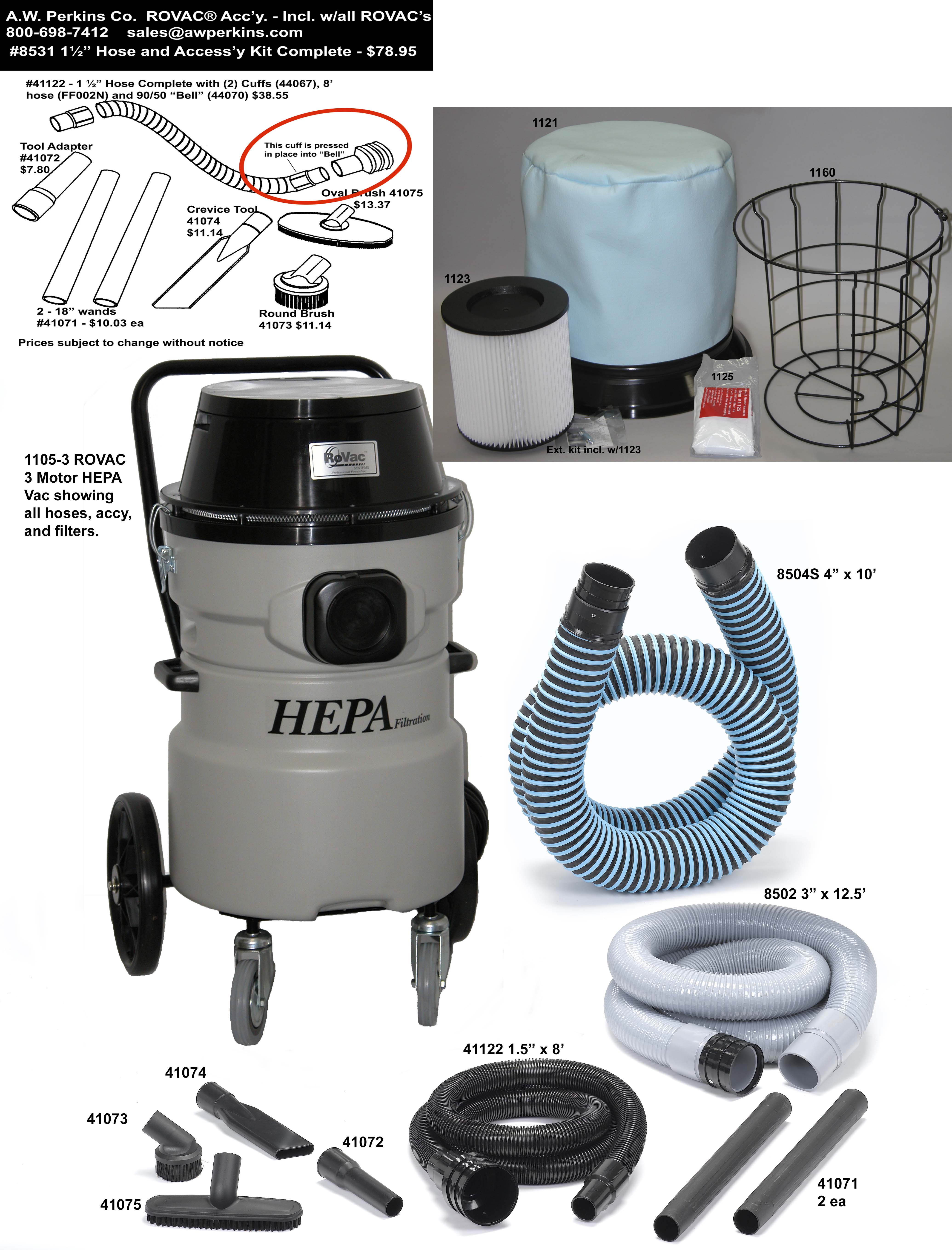 ROVAC® 3 Motor Powerhead draws 405 CFM at 70" water column suction. Use one, two or three motors as needed for task at hand. Able to control dust during sweeping and pickup debris during final cleanup. Three levels of filtration, SootStop dacron pre-filter, blue fluoropolymer coated primary microbag filter and HEPA cartridge filter. Use of SootStop dacron bag is optional, but highly recommended whenever fly ash is encountered such as with oil or coal burning appliance chimneys. Microbag filter stops 99% of fine debris, HEPA filter assures that no dust will enter your customer's home. Rugged roto-molded plastic 15 gallon tank. Comes with a SPARE microbag filter so you can wash one and use the other. Hoses include the 4" dust collector hose which is the primary chimney sweeping hose. The 3" gray multiply hose is for dryer vent cleaning with our (9521) Y-Adapter. And the 1 1/2" hose and accessories are for debris cleanup. Accessories include a round brush, crevice tool and floor brush. 90 day warranty on complete unit, 1 year warranty on the motors and unlimited rear wheel warranty. See YouTube video on how to check motor brushes (item 1143), https://www.youtube.com/watch?v=QHQYXB6dJfg.