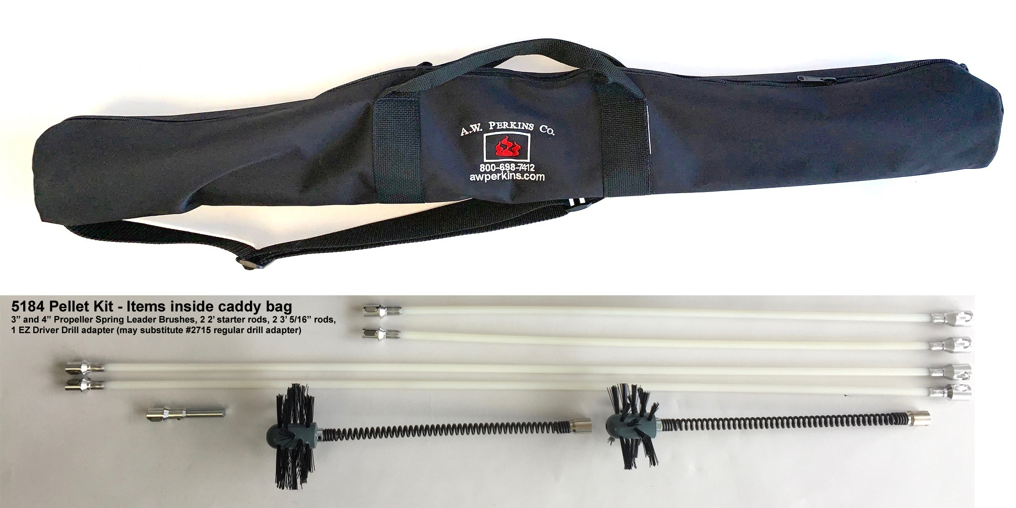 Kit includes 3" x 10" Spring Leader Propeller Brush, 4" version of same, 2 5/16" x 2' rods and 2 5/16" x 3' rods plus an EZ Driver 2715EZ drill adapter and 7613 Zip Up AWP Ballistics Nylon Caddy Bag.  For pellet vent or dryer vent cleaning.  Built in savings over 10% with this kit!