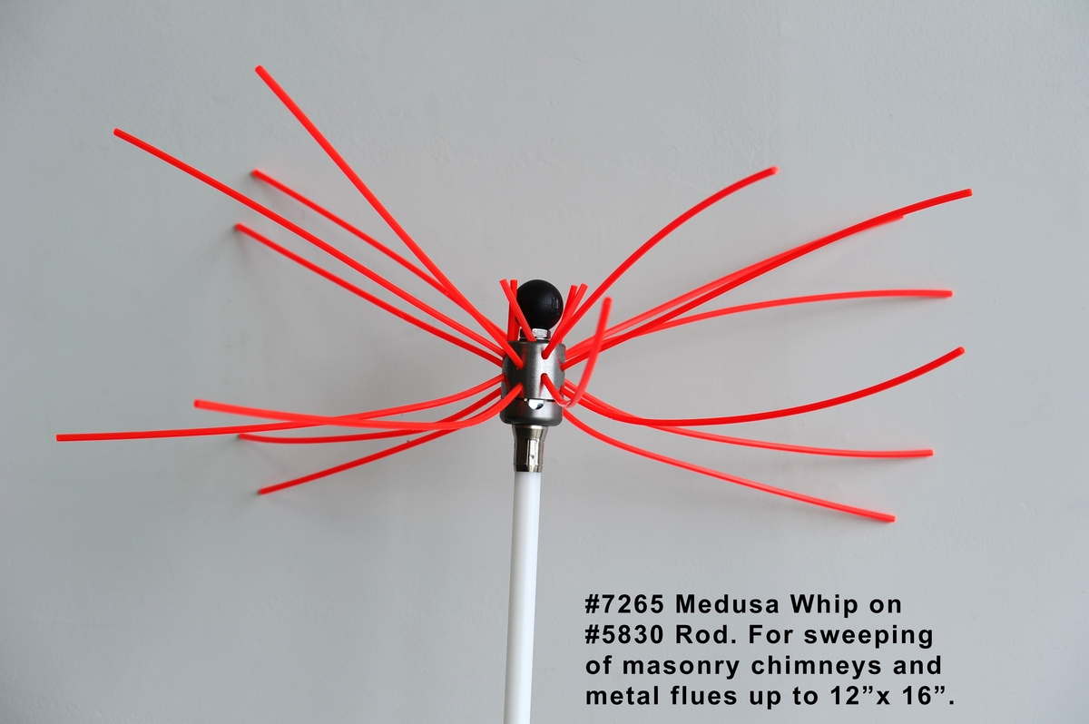 USE WITH: A.W. Perkins #7265 Medusa Whip for flaky debris which is shown in picture, #7255 Cable Loop for light stage 2 glaze typically found in fireplaces or #7266 Euro Whip for lighter soot debris. The new Large Missile Aluminum Head in a 24", #RO14 is ideal for factory built fireplace flues. May be used for chain deglazing (use our 7245, 7245L, or 7266 w/chains option on lighter glaze). For really heavy deglazing that will take a long time the 3/4" solid Slick #7530 or new ButtonLok II #7540D rod is a better choice.