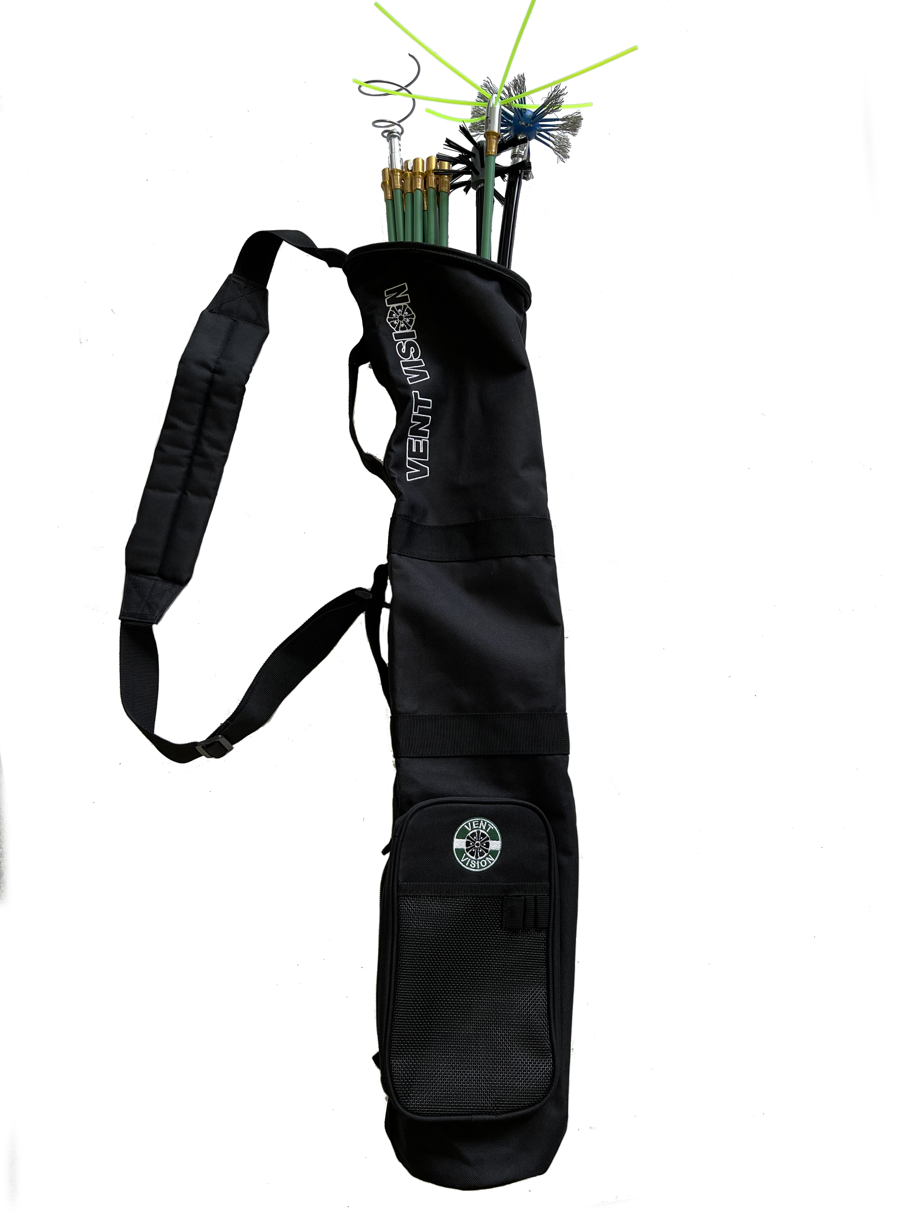 Ballistic nylon bag, stiffened top keeps bag open to access rods as you use them. The pockets are handy to hold extra bits and adapters. Reinforced for long life. Holds up to 20 rods comfortably. The padded strap goes over the shoulder. There are also twin carry handles for hand carry. Shown with rods (not included). Imported.