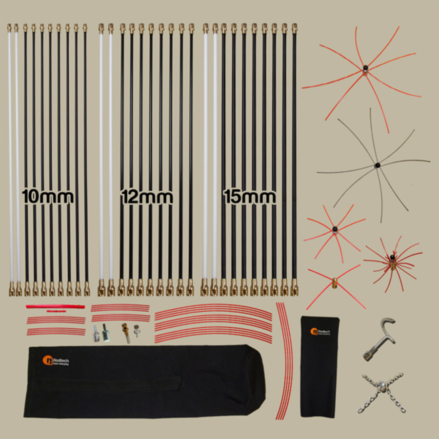 The Rodtech Click Starter PLUS Kit is designed to allow you to power sweep and traditionally chimney sweep lined and unlined flues with a range from 100mm (4 inches) up to 500mm (20 inches) and above. The flue brushes will allow you to sweep all types of flues better and faster than you can by using a traditional chimney brush. This professional chimney sweep equipment is not designed for the amateur chimney sweep. We have tried to describe the chimney sweeping equipment to the best of our ability and included as much application information as possible. Call us with your specific application questions at 800-698-7412.